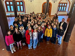 Das Thema „Gemeinde“ steht im Heimat- und Sachunterricht in der 4. Klasse im Lehrplan. Eigentlich ein trockenes Thema… Aber wenn der Bürgermeister ins Rathaus einlädt und erzählt, dann wird es spannend!Am 3. Dezember 2025 durften die vier dritten Klassen hautnah erleben, wie Stadtpolitik gemacht wird. Der 1. Bürgermeister der Stadt Dettelbach Matthias Bielek nahm sich den ganzen Vormittag Zeit, um den Grundschulkindern das Rathaus zu zeigen und Rede und Antwort zu stehen. Nicht nur das. Viel Interessantes konnten alle erfahren. Zum Beispiel, dass das Holz für die Stützpfeiler im großen Saal des Rathauses zwischen 1300 und 1400 geschlagen wurde, welche Kosten der Aufzug in diesem historrischen Gebäude verursachte und dass der reich verzierte Bürgermeisterstuhl im Trauzimmer bereits vom Urgroßvater des jetzigen Bürgermeisters benutzt wurde. Am spannendsten war es, als die Grundschüler im Sitzungssaal selbst zu Stadträten wurden und wie in einer echten Stadtratssitzung diskutieren und entscheiden durften. Die Spielplatzsituation in Dettelbach und den Ortsteilen stand auf der Tagesordnung. Argumente wurden ausgetauscht, es wurde debattiert und abgestimmt. Danach hatten die Schülerinnen und Schüler viele Fragen an den Bürgermeister. Warum macht er diesen Beruf? „Weil ich in Dettelbach gestalten und die Stadt weiterentwickeln möchte.“ Was machte er vorher beruflich? „Sportmoderator. Da traf ich sogar Ronaldo. Aber der ist auch nur ein Mensch mit besonders vielen Muskeln.“ Matthias Bielek erzählte packend und lebendig. Die Kinder konnten sich kaum losreißen. Dabei stand im Anschluss dann auch der Besuch des Verwaltungsgebäudes auf dem Programm. Hier durften die Kinder alle Ämter besuchen und bekamen Einblick in die vielen Aufgaben einer Stadt. „Gemeinde“ – ein trockenes Thema? Von wegen.