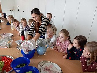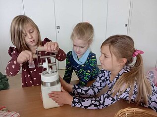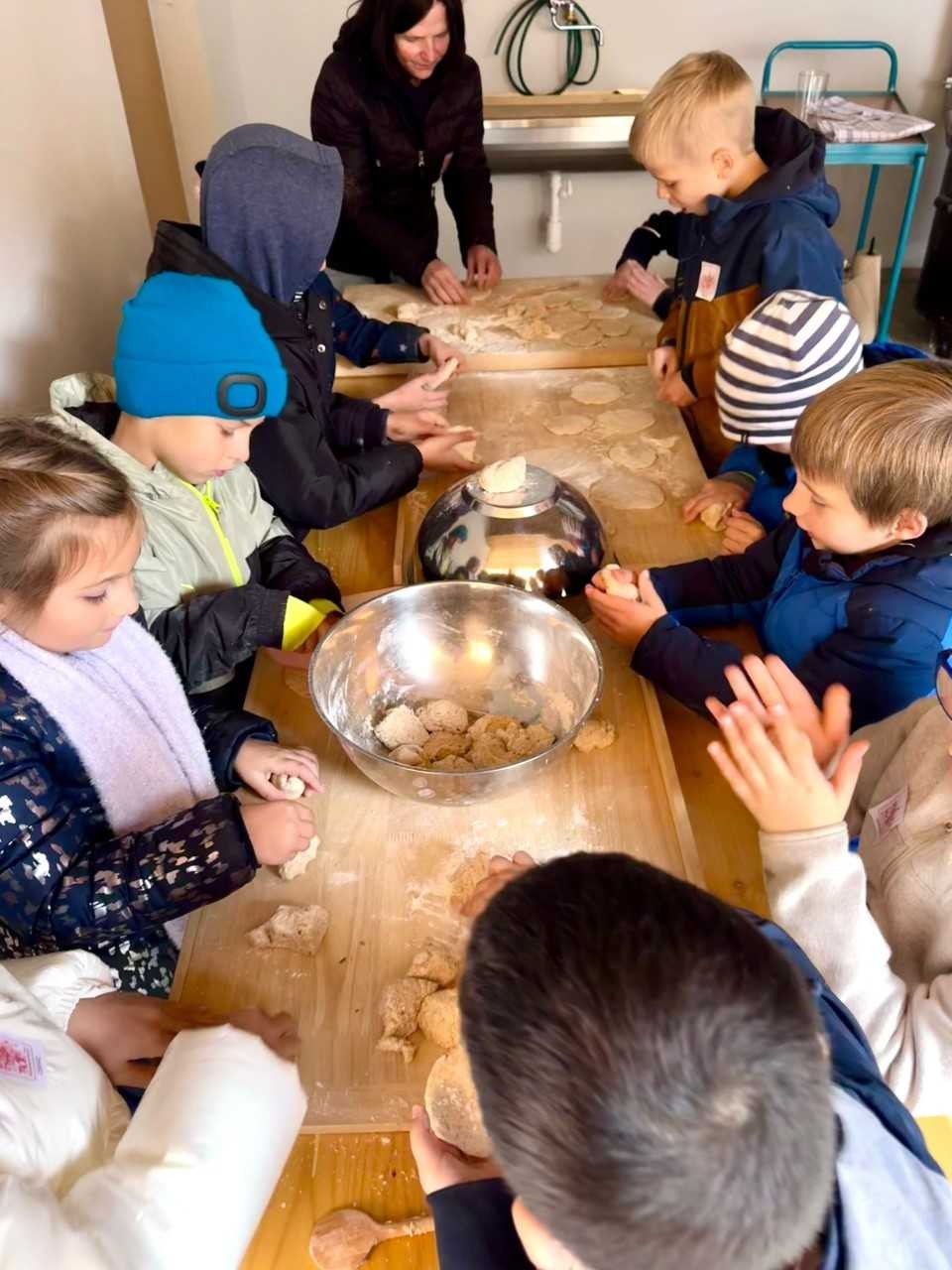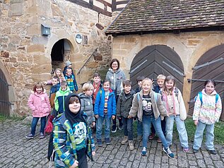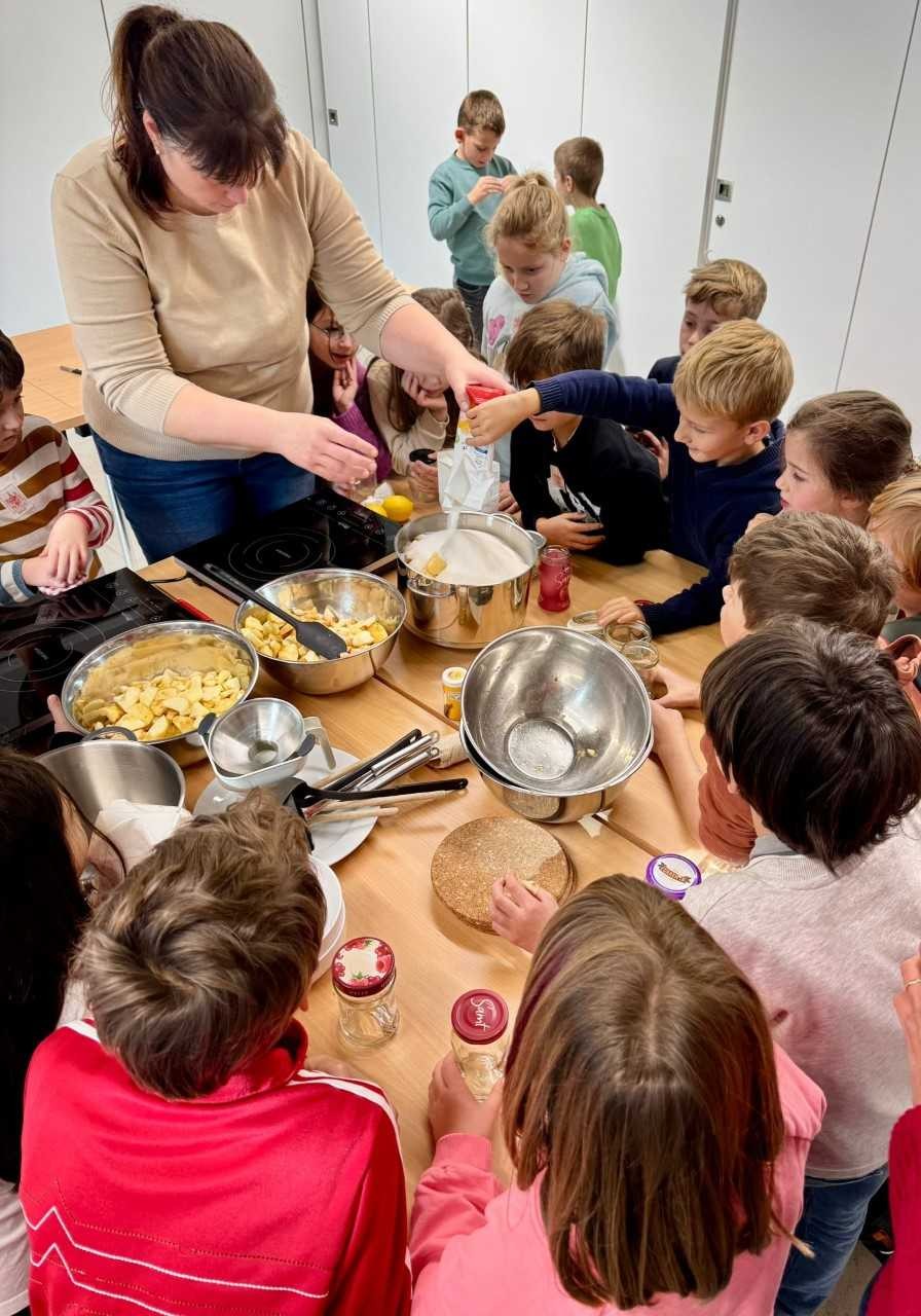 Am Freitag, den 31.10.2025 besuchten die Zweitklässer der Grundschule Dettelbach das Kirchenburgmuseum in Mönchsondheim. Unter dem Motto Alltagskompetenzen entdeckten die Schüler bei einem Rundgang durch das Museum mit Dorfgeschichte, wie die Menschen früher hier gelebt und gearbeitet haben. In drei Gruppen erfuhren die Kinder mehr über Milchviehhaltung früher und heute, die Verarbeitung von Korn zu Mehl und die verschiedenen Möglichkeiten des Konservierens und Lagerns von Lebensmitteln. Gemeinsam erarbeiteten sie, wie ein abwechslungsreicher Speiseplan gestaltet werden konnte. Im Anschluss wurde frischer Rahm zu Butter geschlagen, knusprige Fladenbrote im Holzofen gebacken und leckere Marmelade aus frischen Früchten zubereitet. Bei einer gemeinsamen Brotzeit ließen die Kinder sich die selbst zubereiteten Speisen zum Teil mit Rohkostgemüse und frischen Kräutern aus dem Kräutergarten schmecken.